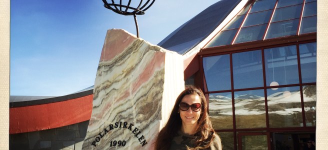 Ci siamo capitati intorno alle 11 di mattina e ci saranno stati oltre 22 gradi: quindi mi sono tolta il piumino e sono rimasta in felpa. Gesto che fa una certa impressione se hai i piedi appoggiati sulla linea che segna il Circolo Polare Artico. È posto lungo il parallelo a 66°33’39” di latitudine nord e attraversa Norvegia, Svezia, Finlandia, Russia, Stati Uniti cioè Alaska, Canada, Groenlandia, Islanda. E non c’è praticamente niente, a parte un’astronave rossa che assomiglia a un palazzetto dello sport degli anni Ottanta. È il negozio che vende t-shirt, felpe, tazze, magneti, segnalibri e adesivi souvenir con su scritto «Ho attaversato il Circolo Polare Artico».